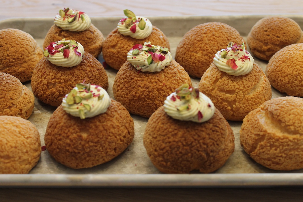 Een soes is eigenlijk gewoon een leeg canvas. Je kunt er álles mee doen. Natuurlijk, klassiek vul je ‘m met slagroom of banketbakkersroom, maar waarom daar stoppen? Onze eigen Tascha roerde mascarpone, slagroom, pistacheboter en een vleugje rozenwater door elkaar, en dat was dus echt gevaarlijk lekker: romig, notig, zoet en bloemig!