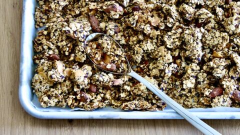 Dit nieuwe recept van Jeroen geeft een heerlijke krokante granola met grote clusters. Er is geen suiker of vet aan toegevoegd zodat je daarin zelf je keuzes kan maken. Door het chiazaad en lijnzaad te weken, krijgt het geheel samenhang en wordt het rijk aan vezels, proteine en omega 3. Lekker en gezond, wat wil … Meer lezen over Amandel granola met grote clusters