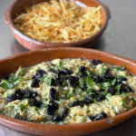 - Giet het mengsel vervolgens in een serveerschaal en bestrooi met de olijven. Voeg een scheutje extra vergine olijfolie toe en serveer onmiddellijk met de rest van de dunne frietjes.