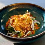 - Marineer de kip met:gember, knoflook, zout, peper, Kashmiri chili, kurkuma en citroensap. Laat 10–15 minuten rusten. Maak ondertussen de kruidensalade. Meng ui in dunne ringen, reepjes groene chili, en de helft van de koriander grof gesneden. Zet apart.