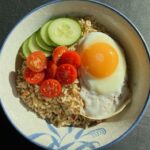 - Schep op een bord, leg er een spiegelei bovenop, serveer met komkommer, tomaat en kroepoek.