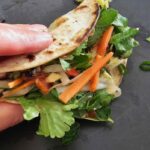 - Vul een hete tortilla met de gemarineerde wortel, kool en komkommer. Doe daar royaal verse kruiden op en Maggi en Sriracha naar smaak.