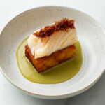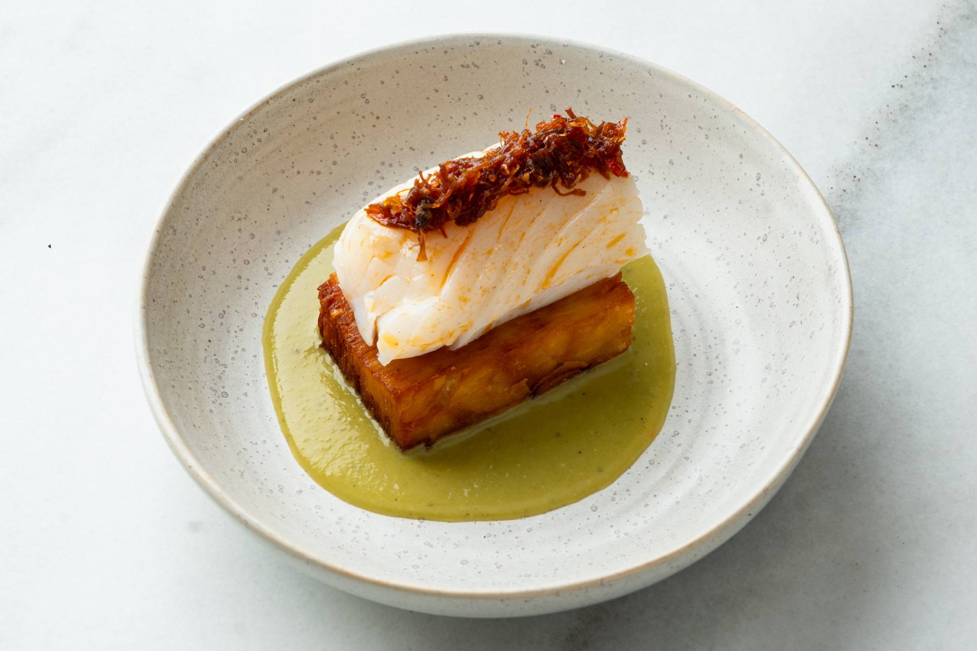 Zacht gegaarde kabeljauwrug met XO saus, 1000 laags aardappel en doperwtencrème